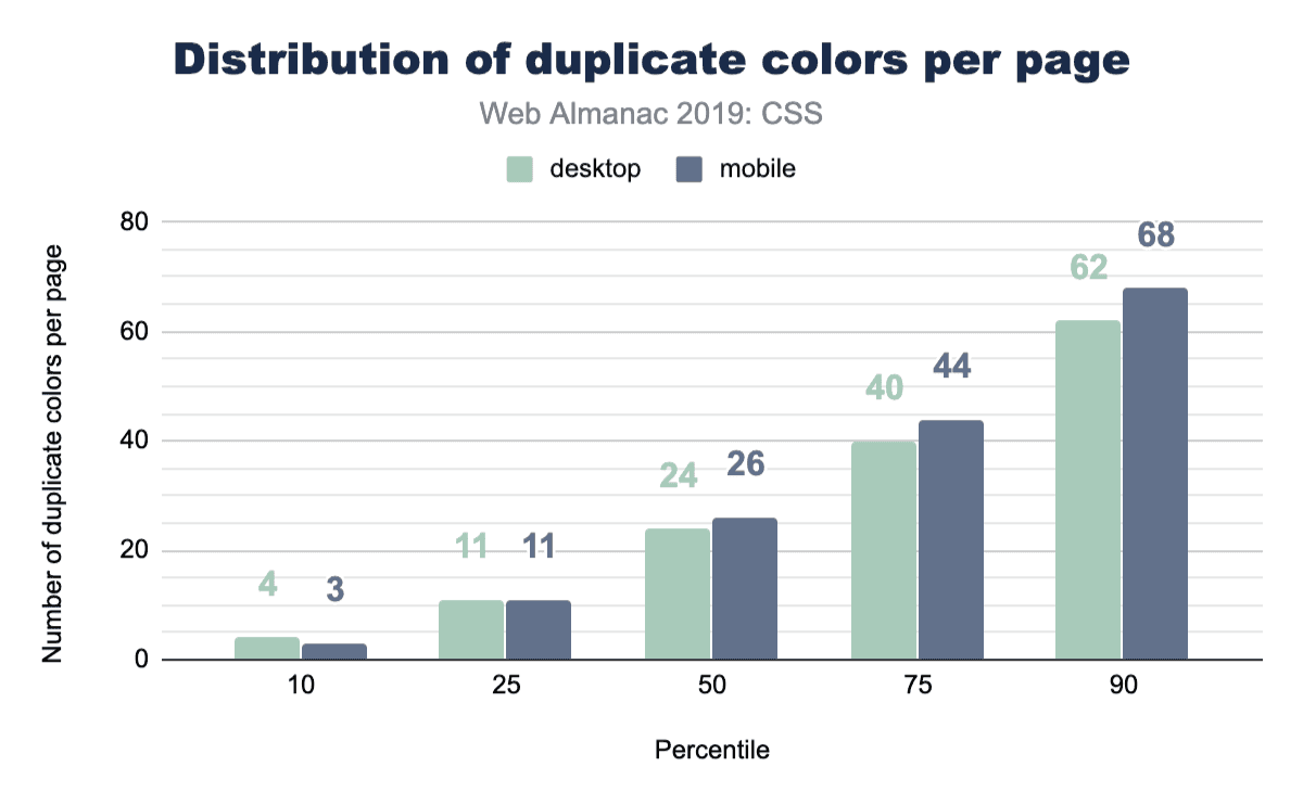 Well, we got curious here and wanted to inspect how many duplicate colors are present on a page. Without a tightly managed reusable class CSS system, duplicates are quite easy to create. It turns out that the median has enough duplicates that it could be worth doing a pass to unify them with custom properties.