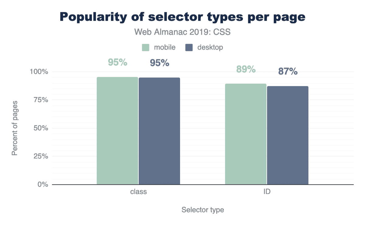 A nice follow up chart is this one, showing that classes take up 93% of the selectors found in a stylesheet.