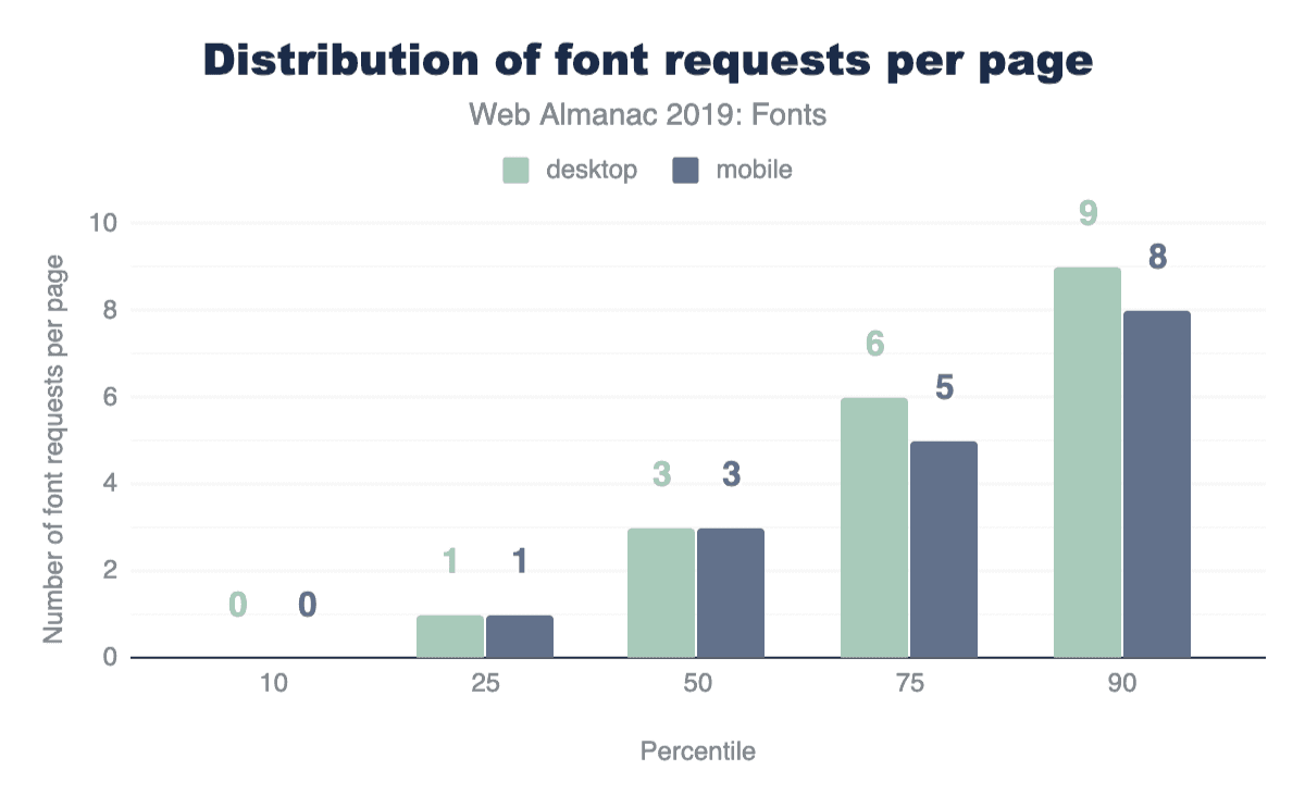The median web page makes three web font requests. At the 90th percentile, requested six and nine web fonts on mobile and desktop, respectively.