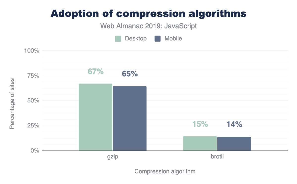 The majority of sites are compressing their JavaScript resources. Gzip encoding is used on ~64-67% of sites and Brotli on ~14%. Compression ratios are similar for both desktop and mobile.