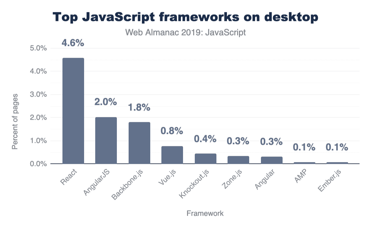 Although there has been a shift towards a component-based model, many older frameworks that follow the MVC paradigm (AngularJS, Backbone.js, Ember) are still being used in thousands of pages. However, React, Vue and Angular are the most popular component-based frameworks (Zone.js is a package that is now part of Angular core).