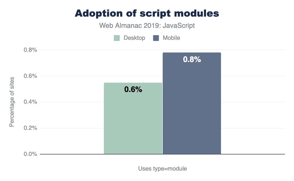 Browser-level support for modules is still relatively new, and the numbers here show that very few sites currently use type="module" for their scripts. Many sites are still relying on module loaders (2.37% of all desktop sites use RequireJS for example) and bundlers (webpack for example) to define modules within their codebase.