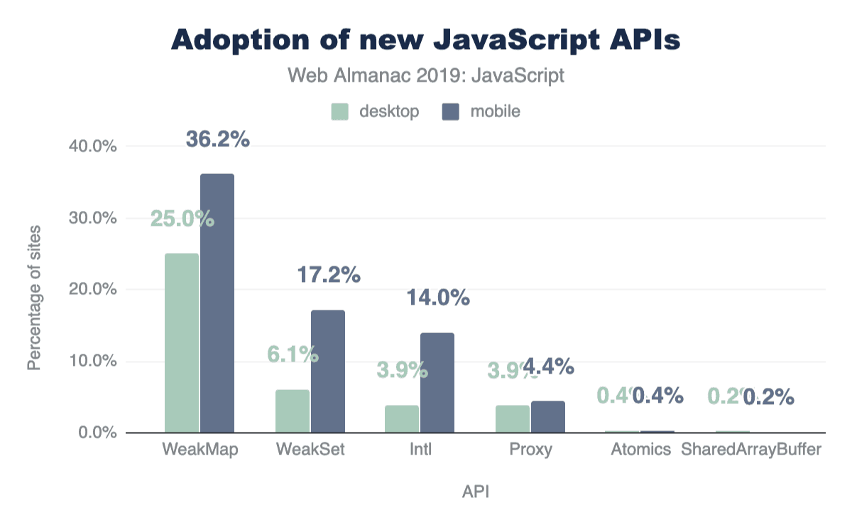 The JavaScript ecosystem continues to change and evolve every year. Newer APIs, improved browser engines, and fresh libraries and frameworks are all things we can expect to happen indefinitely. HTTP Archive provides us with valuable insight on how sites in the wild use the language.
