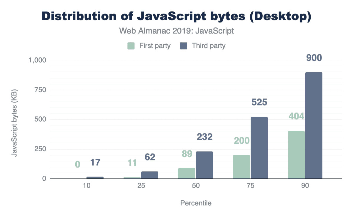 For both mobile and desktop clients, more third-party requests are sent than first-party at every percentile. If this seems surprising, let’s find out how much actual code shipped comes from third-party vendors.