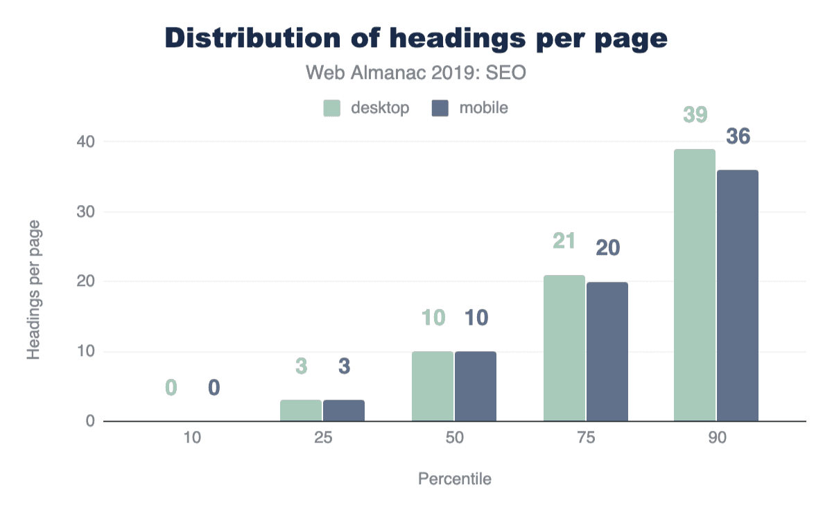 The median number of heading elements per page is 10. Headings contain 30 words on mobile pages and 32 words on desktop pages. This implies that the websites that utilize headings put significant effort in making sure that their pages are readable, descriptive, and clearly outline the page structure and context to search engine bots.