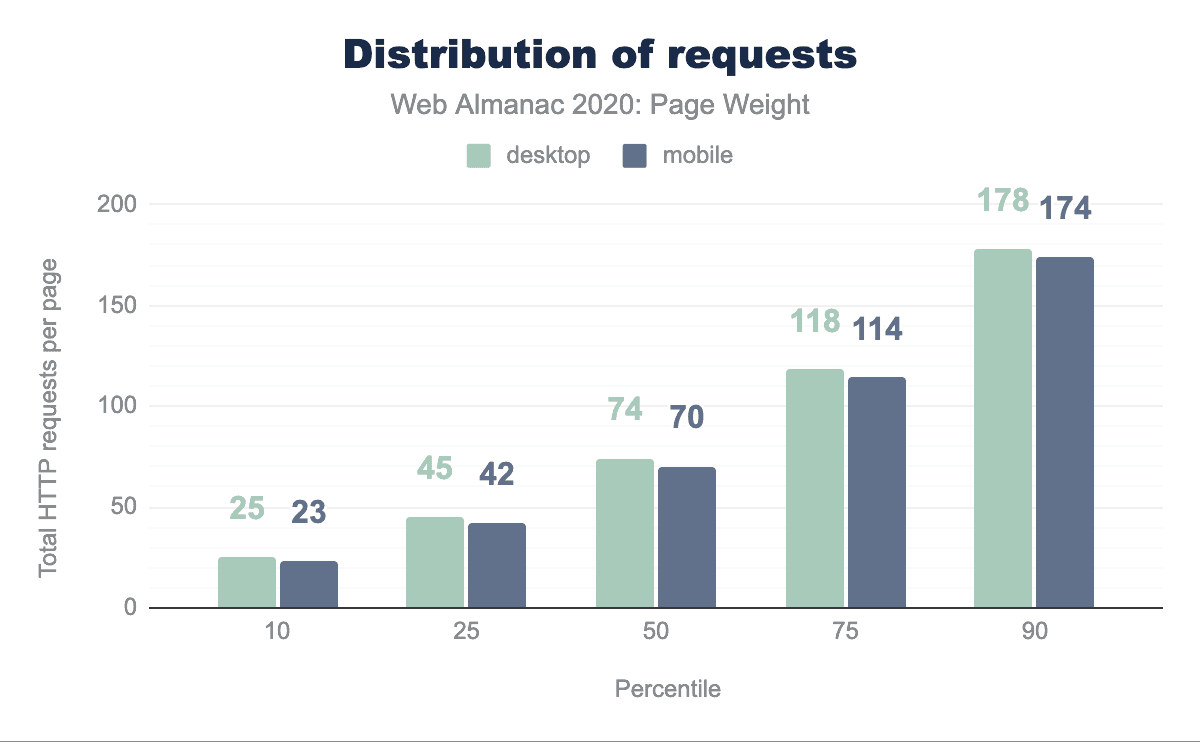 The request distribution shows that the difference between desktop and mobile is not so significant, with desktop leading the way. Something worth noting: the median request on desktop at this time is the same as last year (74), yet the page weight has ticked up (+122kb). A simple observation, but one which confirms the trajectory we’ve seen over the years.