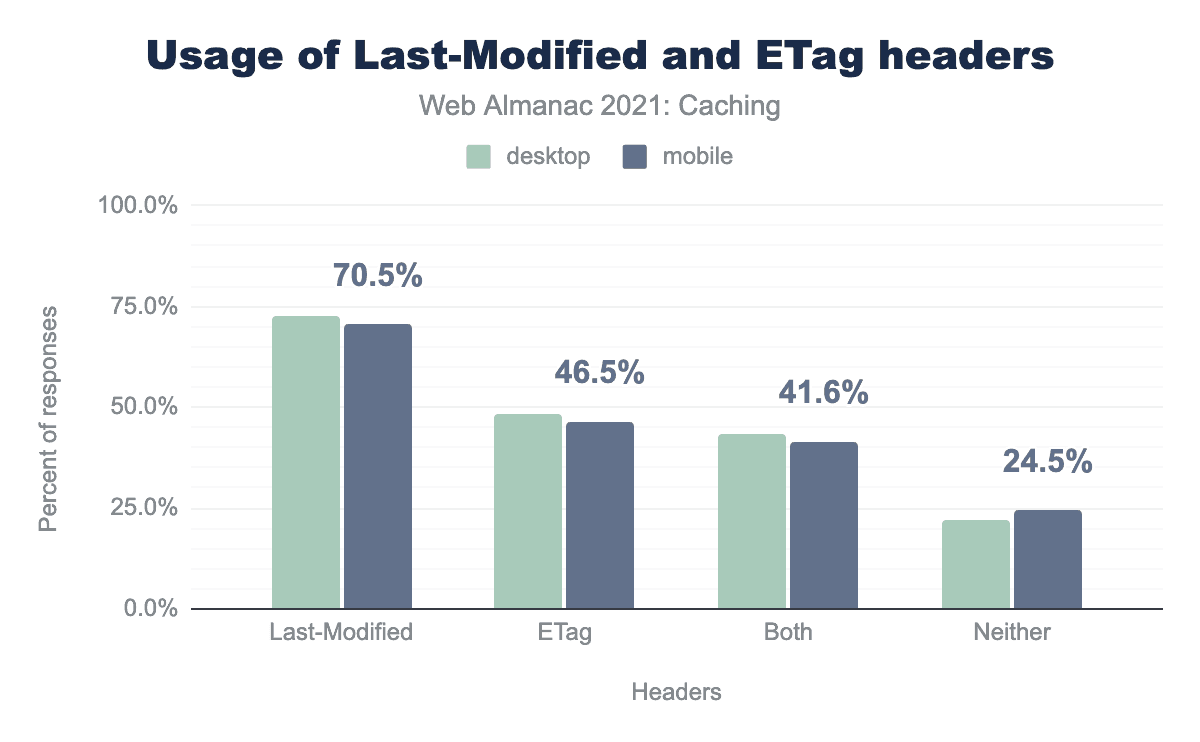 Last-Modified and ETag headers. For desktop and mobile, 70.5% use Last-Modified, 46.5% us ETag, 41.6% use both, and 24.5% use neither.Last-Modified and ETag headers.