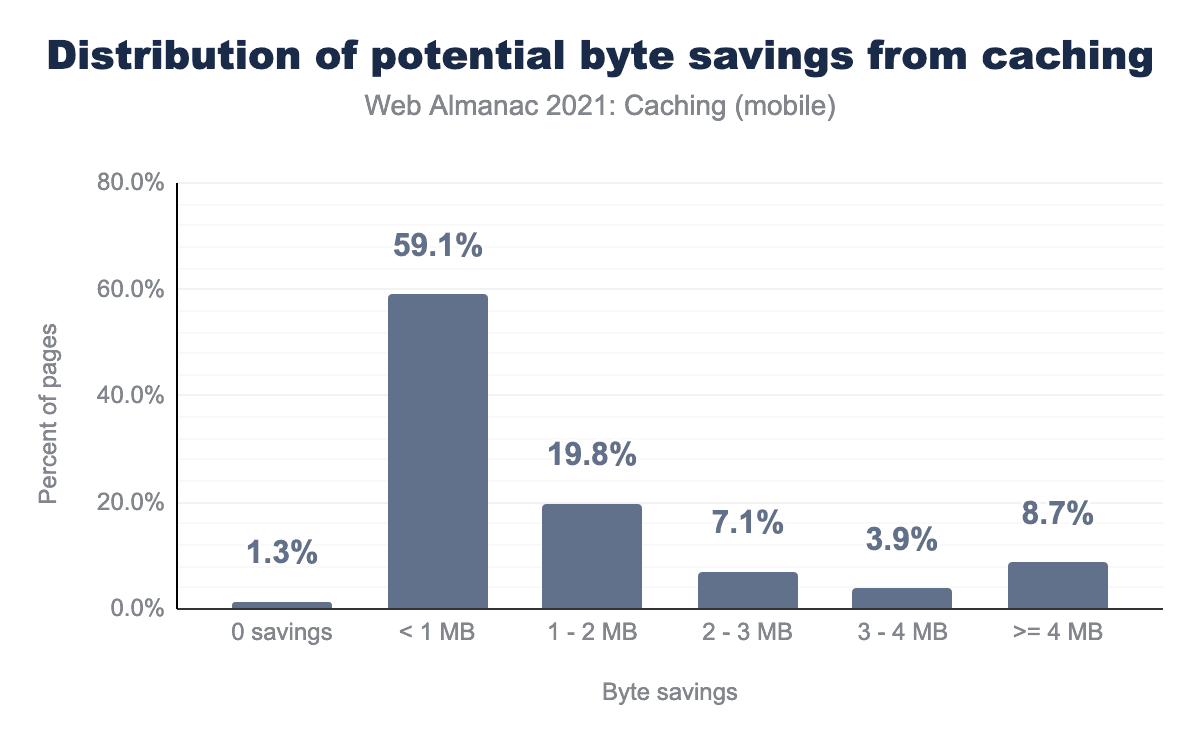 The current percentage of pages audited that have 0 wasted bytes is still relatively low at 1.34%. In the coming years, we’re looking forward to seeing an increase in that percentage as the community continues to focus on optimizing web performance.