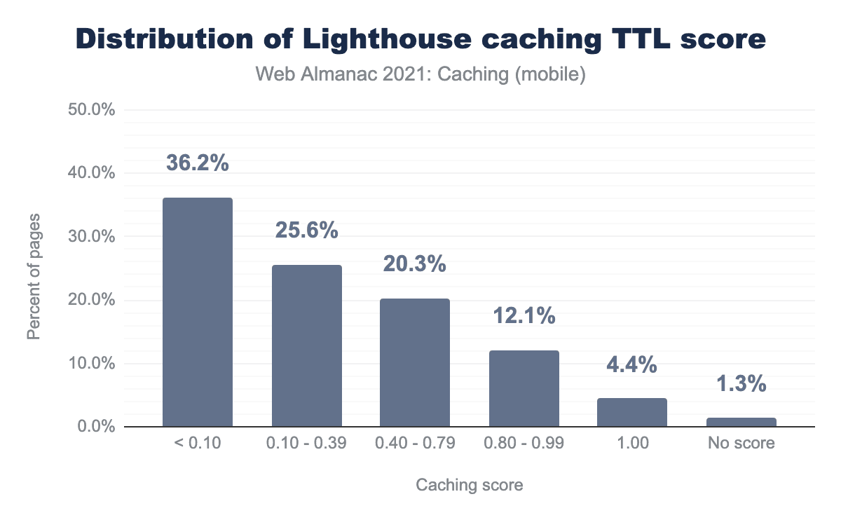 uses-long-cache-ttl for mobile web pages. 36.2% of the responses have a score less than 0.10, 25.6% have a score between 0.10-0.39, 20.3% have a score between 0.40-0.79, and 12.1% have a score between 0.80-0.99. 4.4% have a score of 1 and 1.3% have no score.Based on the Lighthouse caching TTL score, we have seen an improvement in pages ranked with a perfect score of 100 increase from 3.3% in 2020 to 4.4% in 2021.