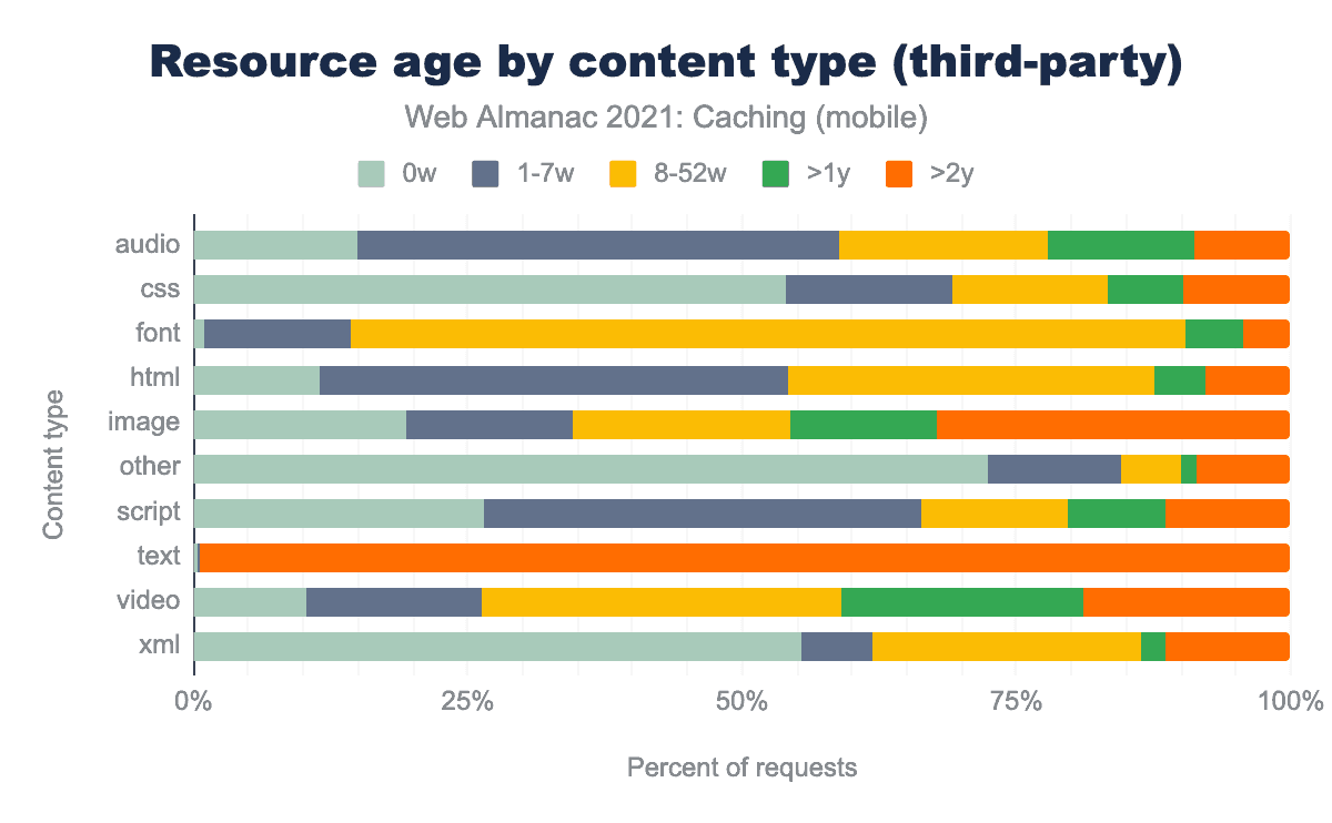 Audio was the most highly cached resource across both first and third parties. However, the resource age varied greatly between first-party (averaging 8-52 weeks) and third-party, at only 1-7 weeks. Audio resources in first-party situations tend to be updated less frequently (why?), so third parties may be capitalizing on a caching opportunity by offering fresher resources.