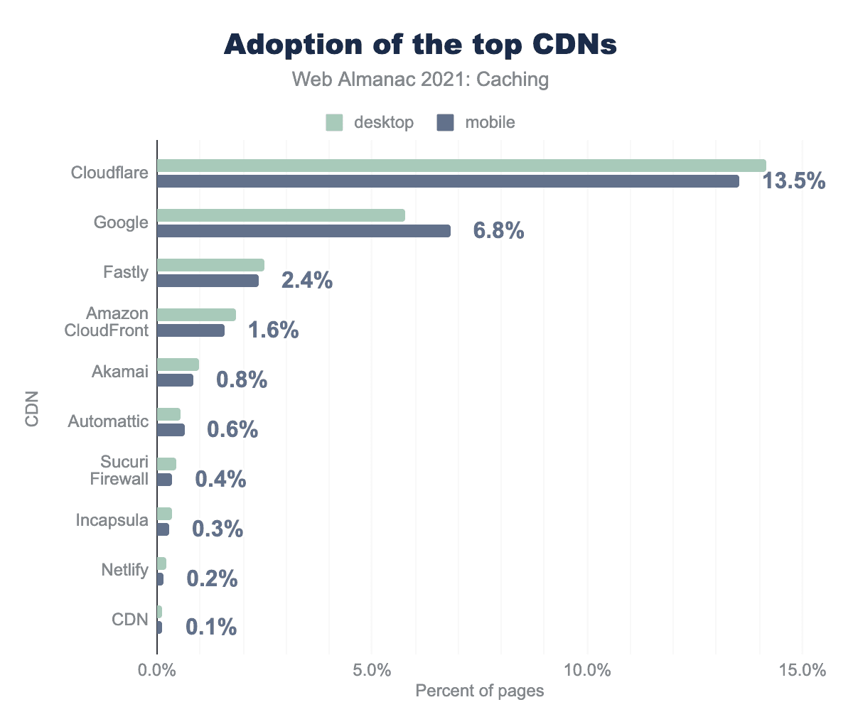 Across the web in 2021, the most popular CDN used for Desktop was Cloudflare with 14% of total pages, followed by Google with 6%. While Cloudflare and Google are the most popular, a large variety of solutions remain available beyond these two including Fastly, Amazon CloudFront, Akamai, and many others.