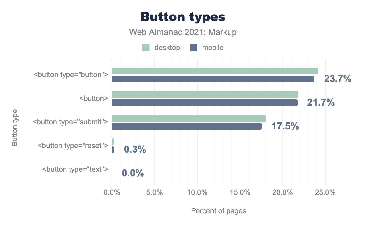 When we compared the data to last year, we noticed a lot more pages had button elements on them. This year we didn’t run a query for input-typed buttons, but we’ve seen a definite decrease in usage for the number of button elements on pages. The Accessibility chapter also has a whole section on buttons, you should read that as well!