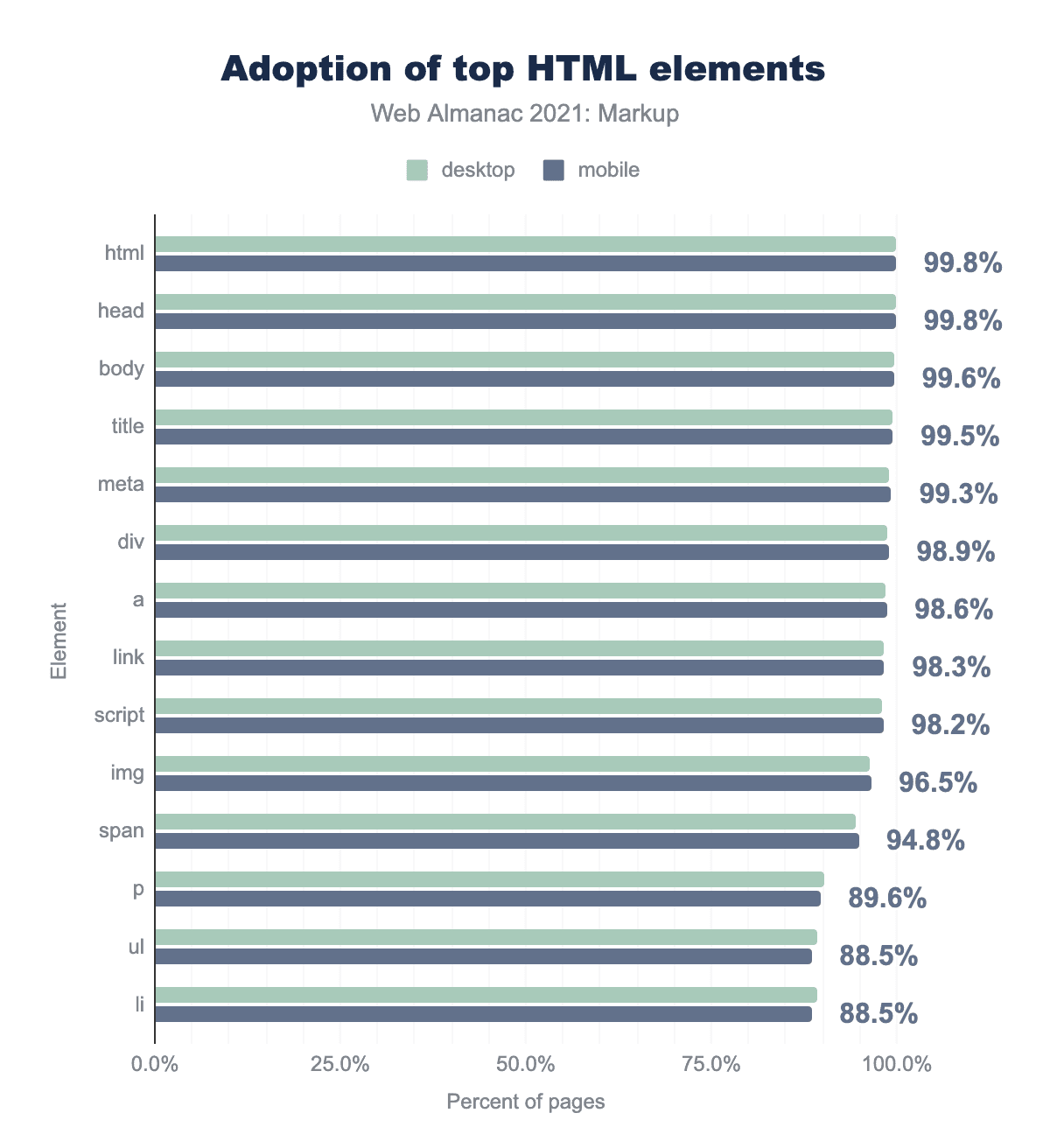 No need to panic, the web isn’t all made up of divs. The median mobile page uses 31 different elements and has a total of 616 elements.