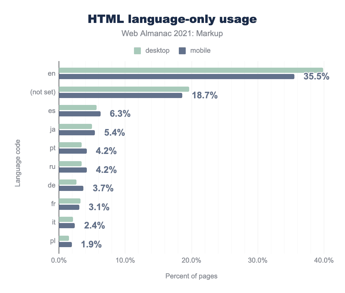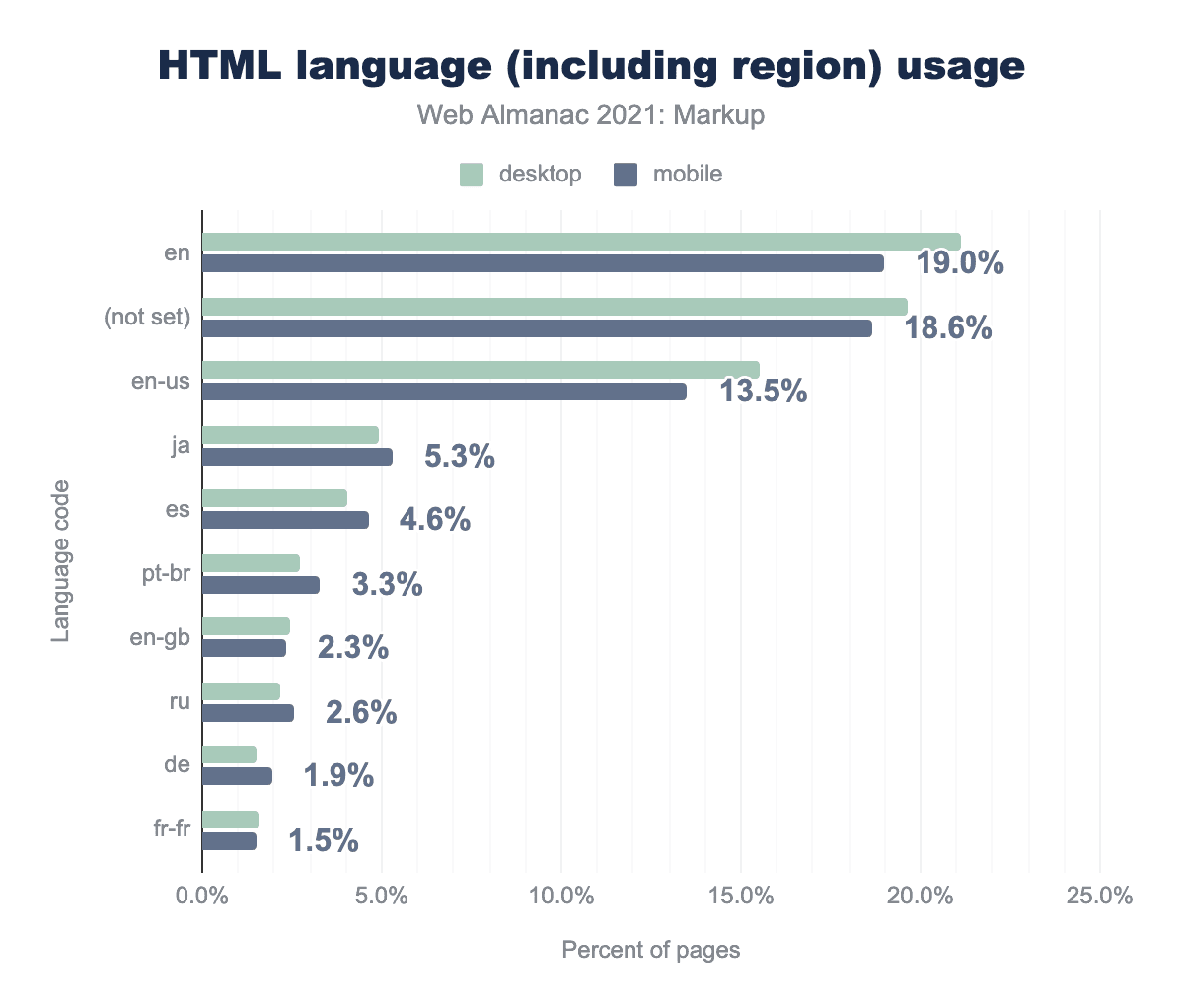 Out of the pages scanned, 19.6% on desktop, and 18.6% on mobile, specified no lang attribute, even though the Web Content Accessibility Guidelines (WCAG) requires that a page language is defined and “programmatically accessible”. Languages can be specified in different ways, including an xml:lang element, which we didn’t check for, so there might still be hope for some of the pages scanned.
