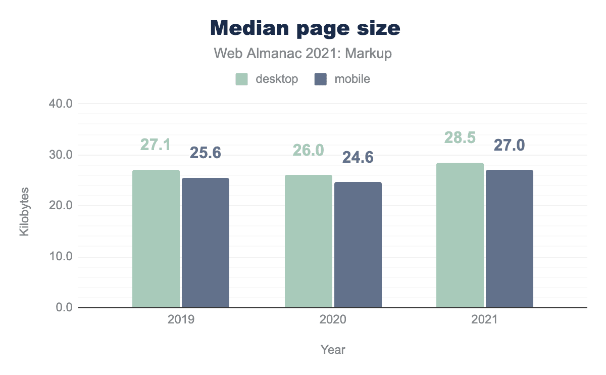 • The median page sizes in 2020 were shrinking when compared to 2019. Looking at the figure above, we’ve had a slight increase this year, after the dip in 2020.