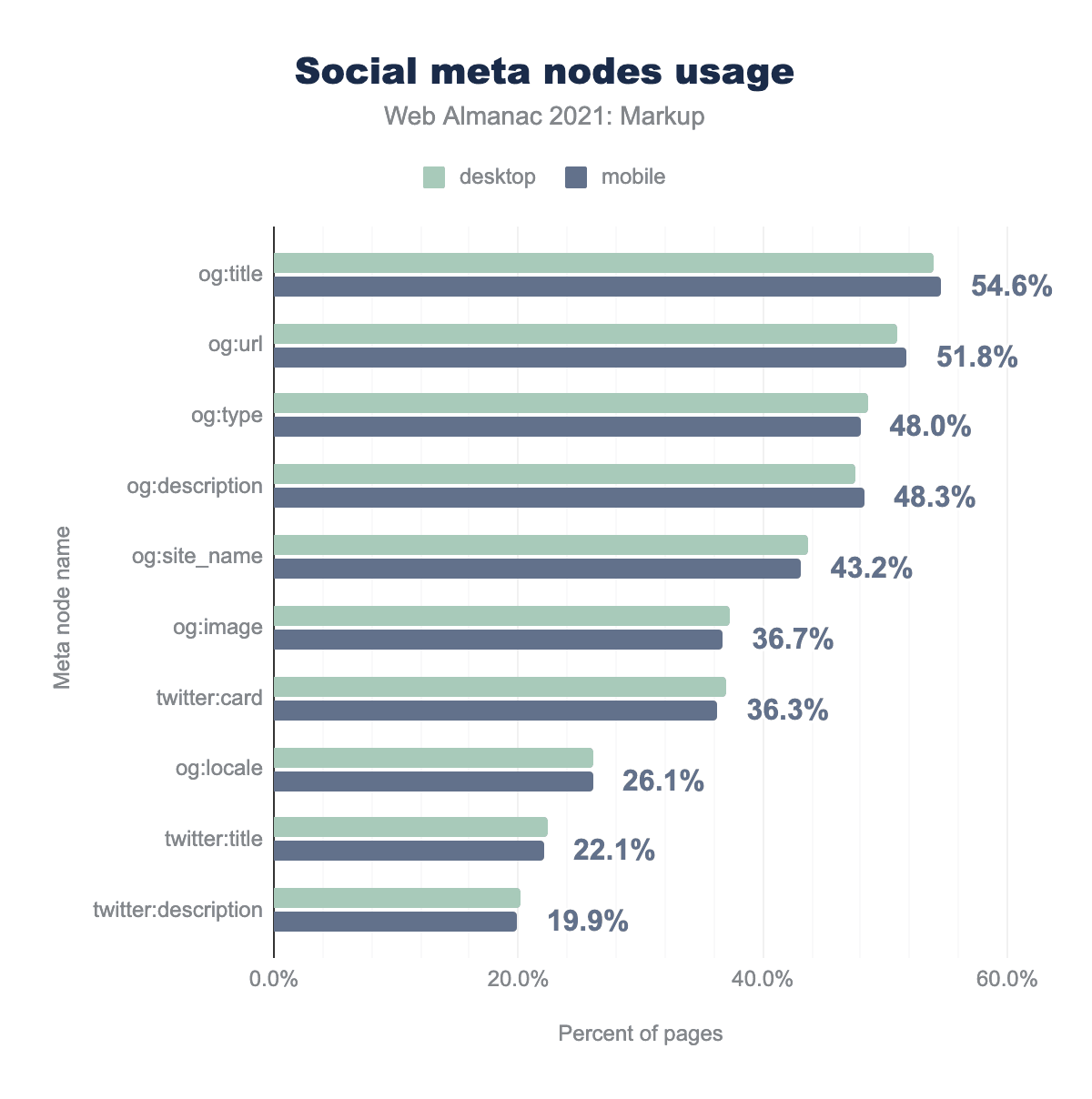 The most common by far are the Open Graph meta elements, used across multiple networks, with Twitter-specific elements lagging behind. og:title, og:type, og:image, and og:url are all required for every page, so it’s interesting that there is a variation in their usage numbers.