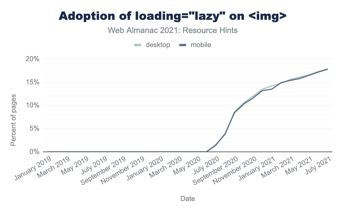 In July of 2020, native lazy-loading was used on just 1% of pages. By July of 2021, that number had exploded, to 18%. This is an unbelievable rate of growth considering the vast number of pages and templates which are not updated from year to year.
