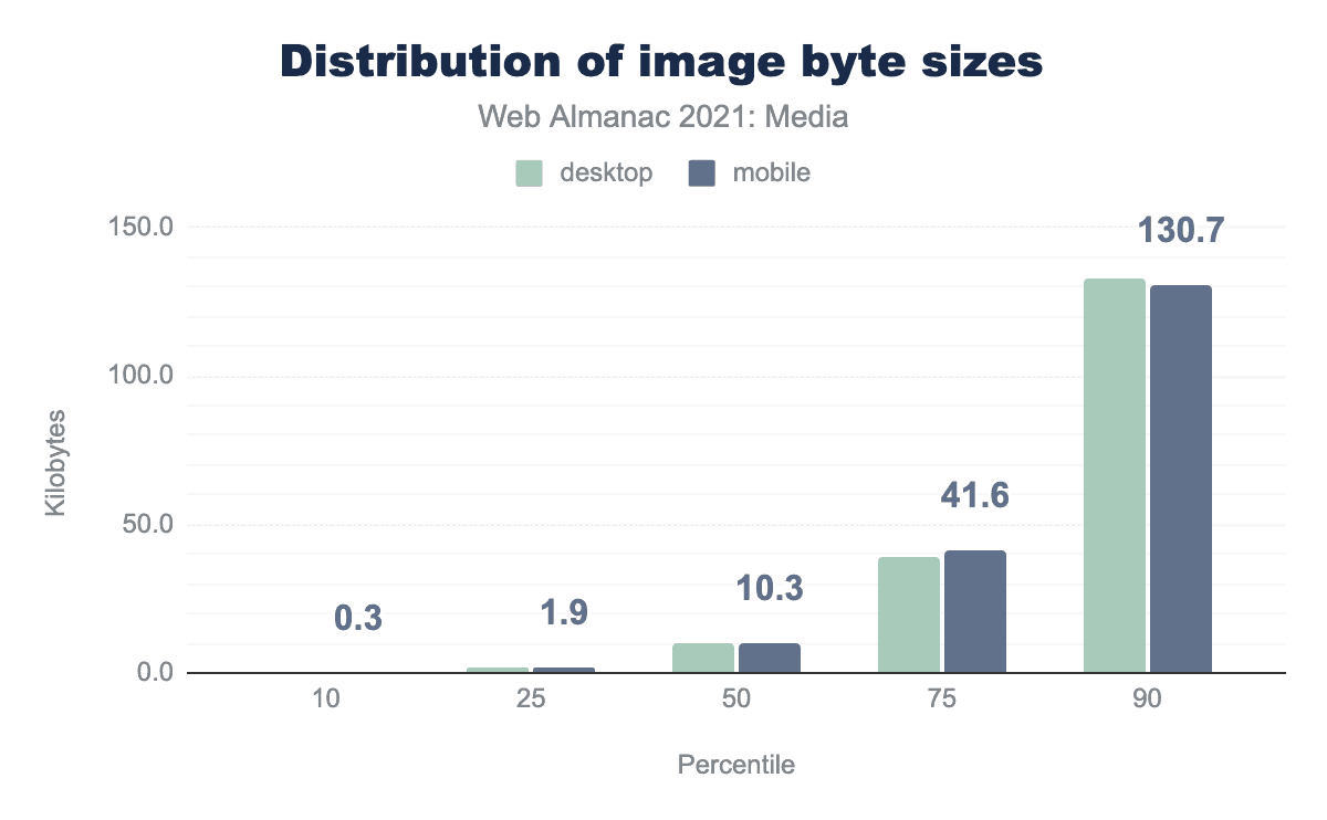 The median contentful <img> weighs in at just over 10kB. But, again, the median page contains more than 15 <img>s so, when looking at the ninetieth percentile of all images across pages, images that push past 100kB aren’t rare at all.