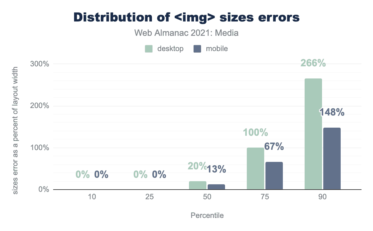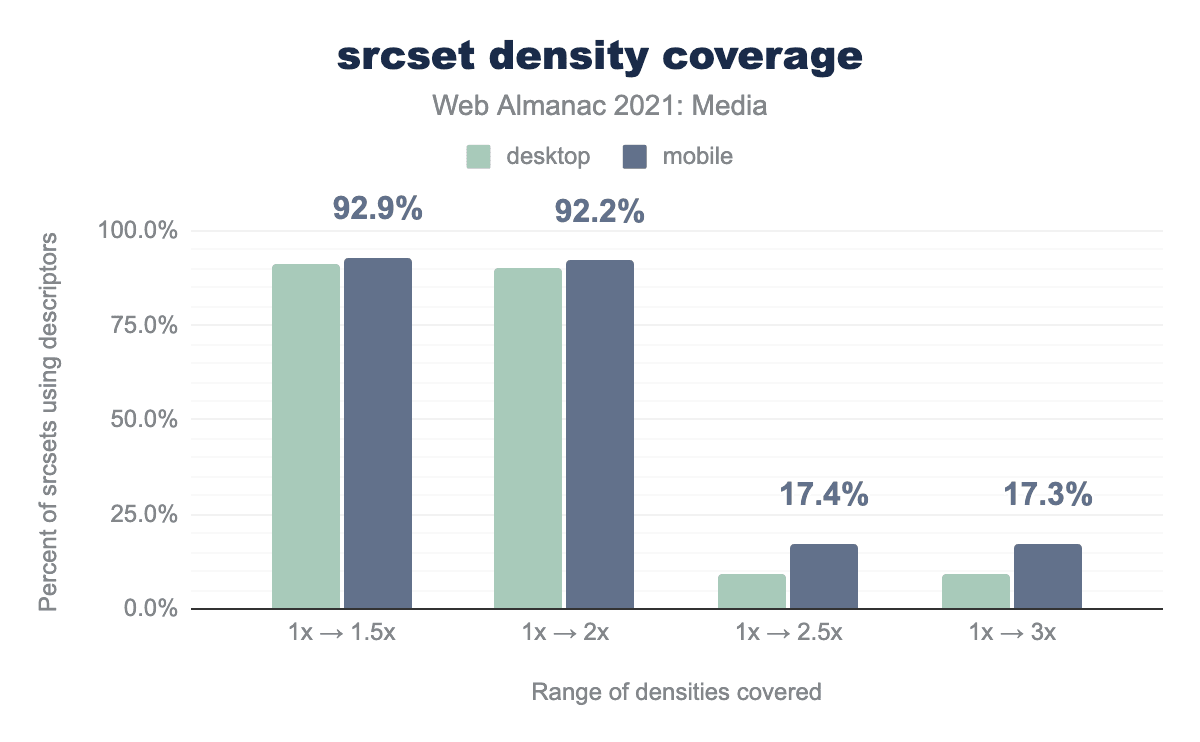 I was also surprised that there was almost no difference between desktop and mobile at the top end of the pixel count distribution. Initially, this seemed to indicate a lack of effective adoption of responsive image features, but when you consider that the mobile crawler has a 360 × 512px @3x viewport (so 1,080 by 1,536 physical pixels), while the desktop viewport is 1,376 × 768px @1x, it isn’t actually surprising: the crawlers’ viewports had similar widths, in physical pixels (1,080 vs 1,376). A bigger difference in physical pixel resolution between the crawlers would be more revealing.