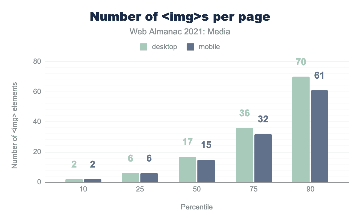 However, when you consider the number of <img> elements per page, this statistic is less surprising. Most pages contain more than 15 images, so they are often made up of many smaller images and icons. Thus, while images with more than half-a-megapixel might only account for one in ten <img> elements, they are not at all uncommon, as we navigate across pages. Many pages will include at least one larger image.