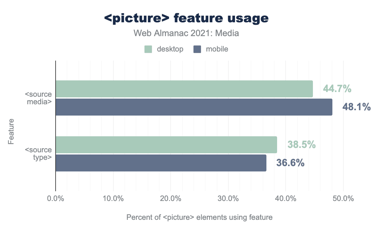 Notably, <source type> and <source media> are not mutually exclusive, and, put together, the usage percentages here do not add up to 100%. This suggests that at least 15% of <picture> elements do not leverage either of these attributes, making those <picture>s functionally equivalent to a <span>.