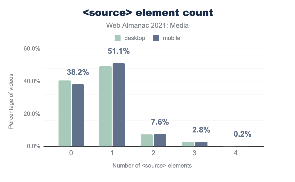 When we look at <source> usage, we see that about 40% of videos have no <source> element—implying that they use the src attribute. This is similar to the ratio found in 2020 (35%).