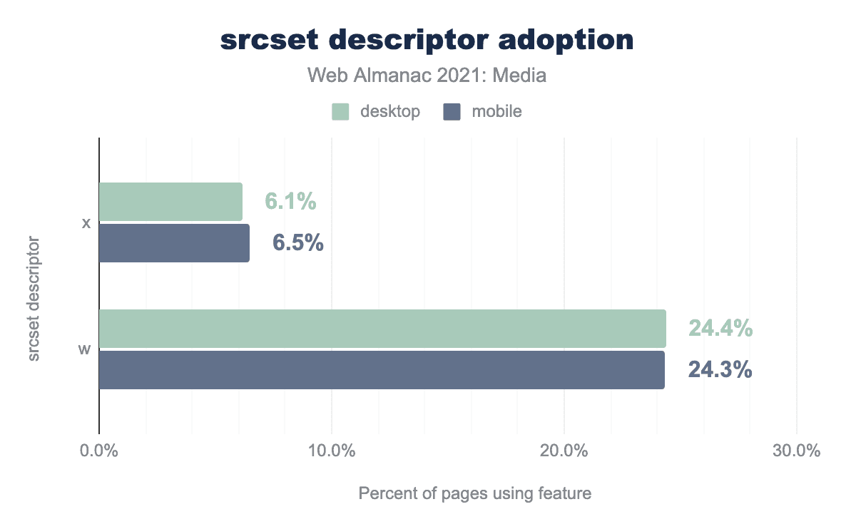 Note that throughout the rest of this analysis, we have excluded single pixel <img>s from the results. For this media chapter, we’re interested in <img> elements that are presenting visual information to the user, not tracking pixels or layout hacks.