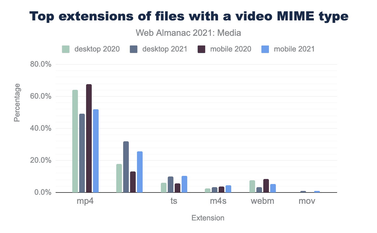 By far, the #1 video format on the web is the mp4 (or MPEG-4), since the mp4 h264 format has 98.4% support in all modern browsers, and the 1.9% of browsers that do not support mp4 have no video support, so the number is really 100% coverage. Interestingly, the mp4 usage has dropped by ~15% YOY on both desktop and mobile. WebM support also dropped significantly YOY (50% drop on both mobile and desktop).