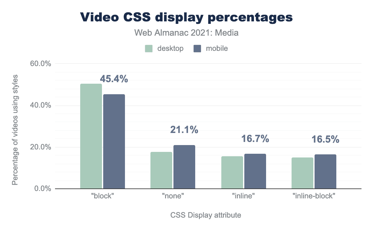 To begin, let’s look at how a video will appear on a page by looking at the CSS display property for that video. What we find is that approximately half of all videos use a display value of block—placing the video on its own line and allowing for height and width values to be set for the video. The inline-block value also allows height and width to be specified—for a total of two thirds of all videos.