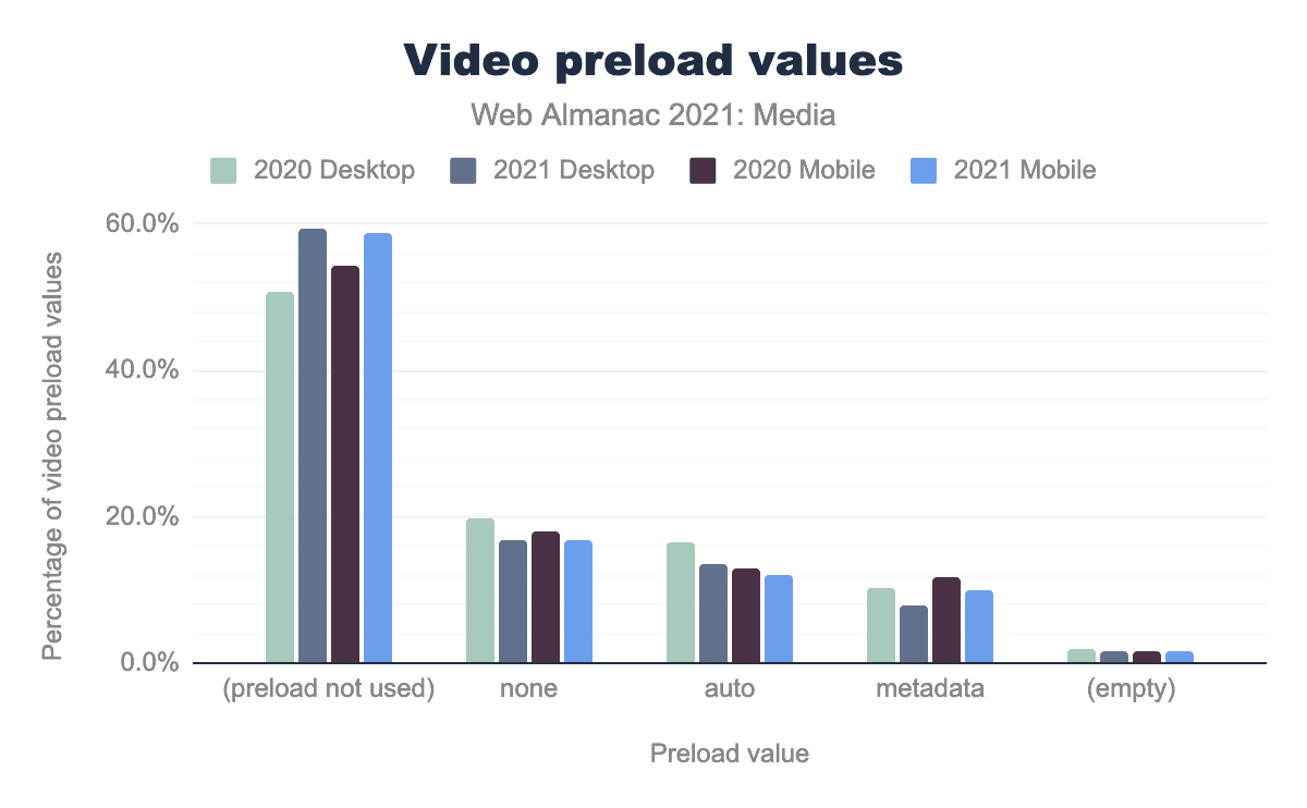 Interestingly, we see a large push away from preload on both mobile and desktop. While it is possible that this changed for many videos, it could just be that the new videos added to the web over the last year do not utilize this setting. From a page weight perspective this is a large win for the web.