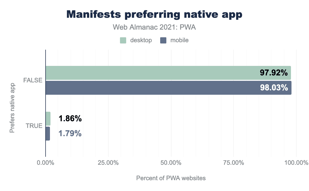 PWA Builder reviewed 200k URLs over a 3-month timeslot and discovered that: