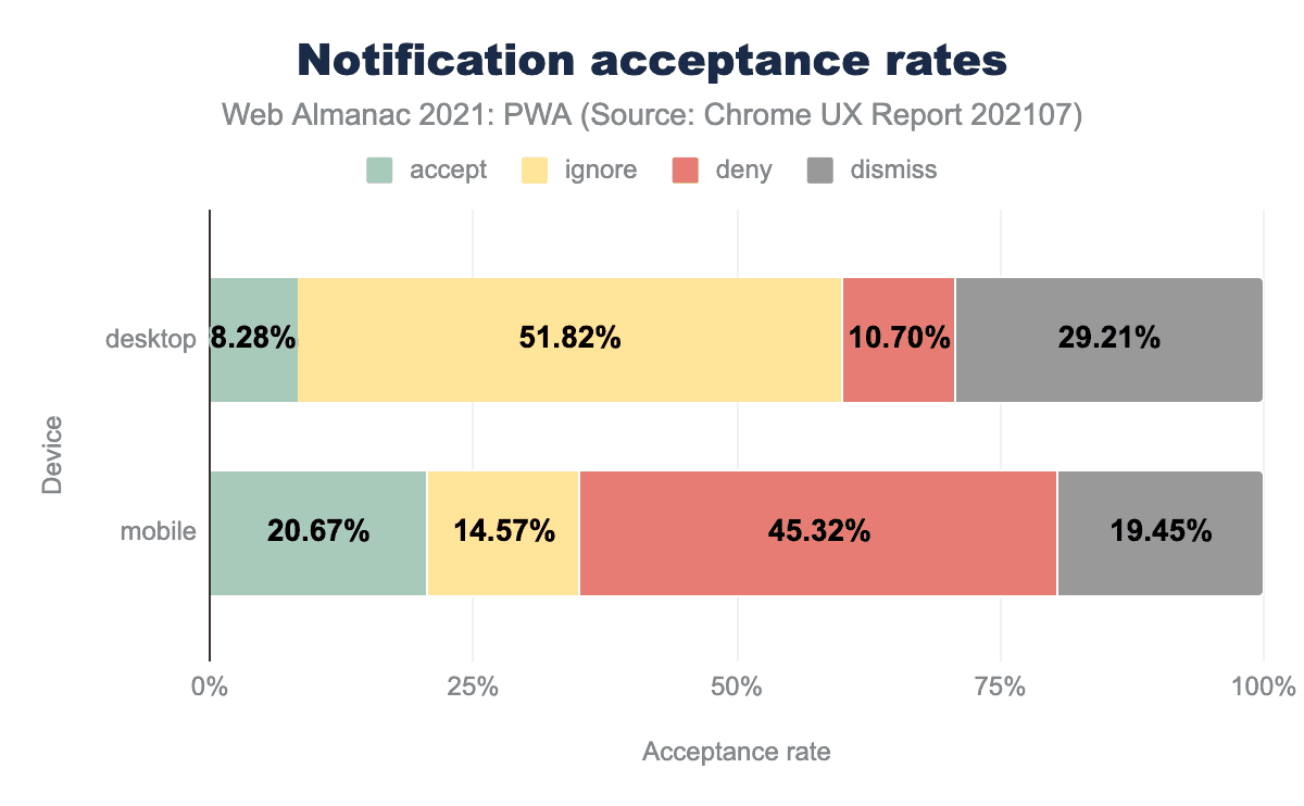 The following chart comes from the Chrome UX Report and shows the acceptance rates for notifications permission prompts: