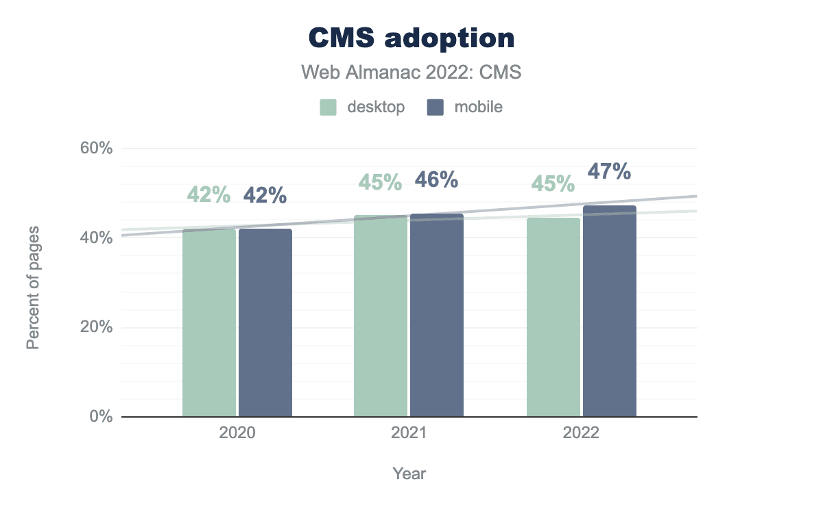 As of June 2022, 45% of the websites in the Web Almanac’s desktop dataset were powered by a CMS, indicating similar usage to 2021. The mobile dataset shows an increase from 46% in 2021 to 47% here in 2022. Looking closer at the desktop raw figures we actually see a slight drop in both absolute and percentage terms, but the drop is more likely an artifact of minor variances in attribution than an indicator of a downward trend in CMS usage. It should be noted that the number of desktop sites tracked by HTTP Archive (and the source CrUX dataset) has fallen considerably from 6.4 million sites to 5.4 million sites, while the number of mobile sites has grown by about 400,000 sites from 7.5 million to 7.9 million sites. We take this increase to reflect continued growth in mobile device usage at the expense of the desktop.