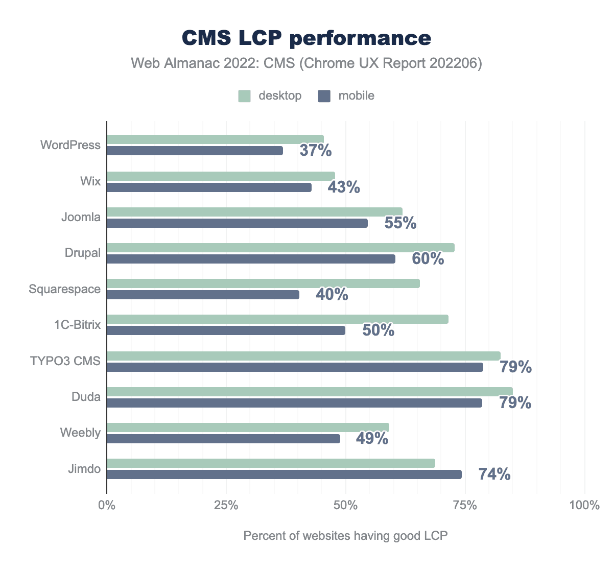 We can see that the median performance scores for most platforms on mobile are low and range from about 19 to 35. Duda at 47 is the exception. As Philip Walton noted in 2021, this does not directly imply bad results in mobile field data, but it does imply that all platforms have room for improvement, especially on low-end devices with network connections similar to those Lighthouse attempts to emulate.