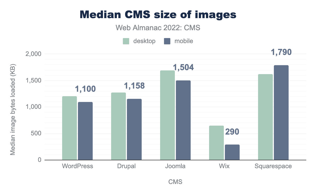 Most of the top five CMSs deliver a median page weight of around ~2 MB, except Squarespace which delivers a larger ~3.5 MB. All except Joomla showed increases in page weight over 2021 data.