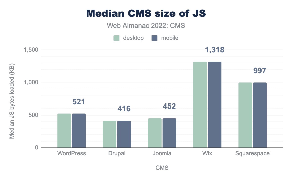 The top five CMSs all deliver pages that rely on JavaScript, with Drupal delivering the fewest JavaScript bytes: 416 KB on mobile. Wix delivers the most JavaScript bytes—over 1.3 MB.