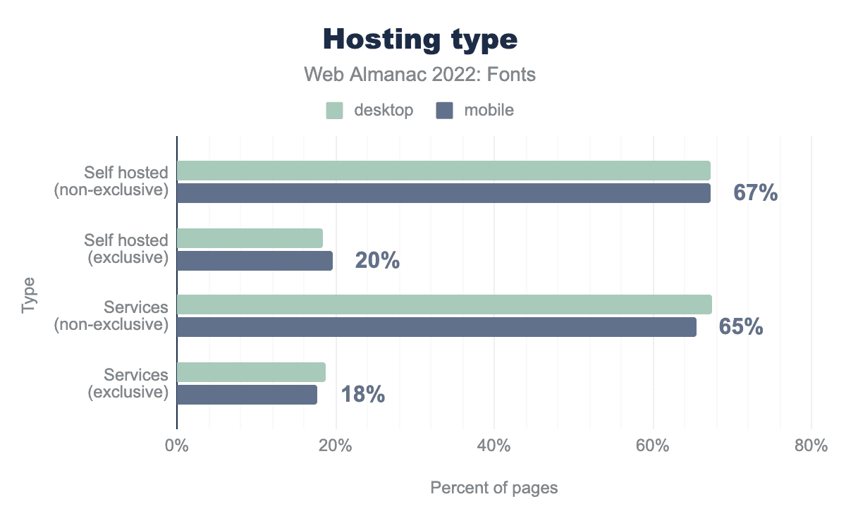 In general, it is a mixture: 67% self host and use a service. Only 19% only use self hosting exclusively. We expect this number to go up in the coming years for two reasons: there is no longer a performance benefit to using a hosted service after the introduction of cache partitioning, and European courts are slowly becoming highly skeptical of European-based companies using Google Fonts.