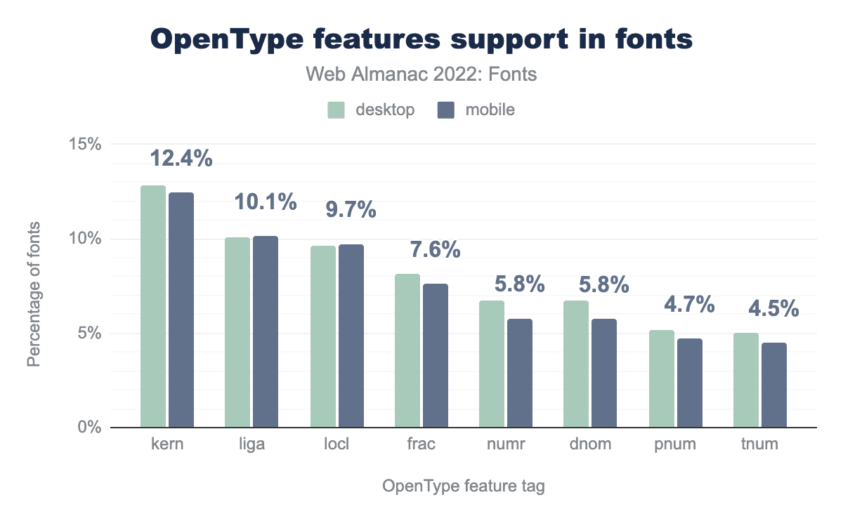 font-feature-settings is used on 13.3% of desktop pages and 12.6% of mobiles pages, and font-variant is used on 3.9% of desktop pages and 3.5% of mobile pages.Overall, usage of OpenType feature usage is quite low on the web. We were hoping most people are using the high-level font-variant properties to enable OpenType features, but their usage is even lower than font-feature-settings. The font-feature-settings property is used on 12.6% of sites, while the font-variant properties are used on only 3.5% of sites.