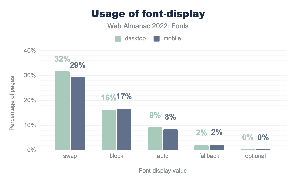 swap is used on 32% of desktop and 29% of mobile pages, block on 16% and 17% respectively, auto on 9% and 8%, fallback on 2% and 2%, and finally optional is on 0% of both desktop and mobile pages.font-display.