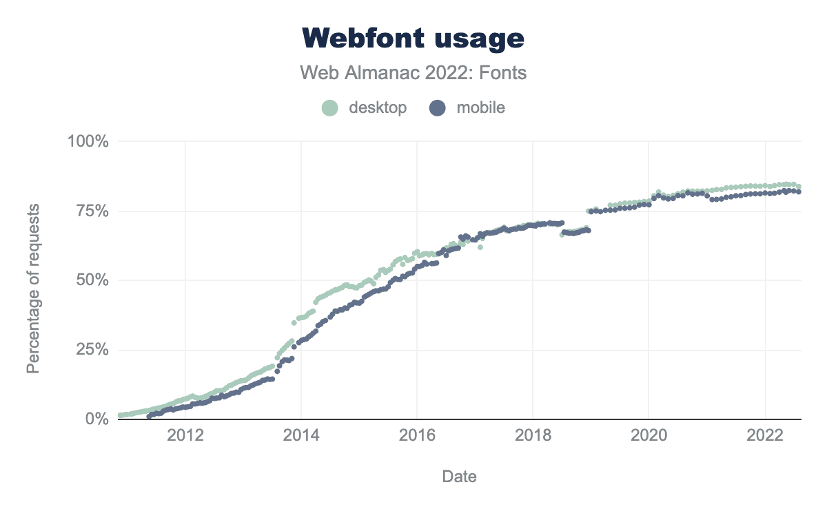 This progression in web fonts shows. Web font usage continues to grow. In the 2020 Fonts chapter, 82% of all desktop sites used web fonts. In the two years since then, usage has increased to about 84%. The numbers are slightly lower for mobile, but represents a similar growth.