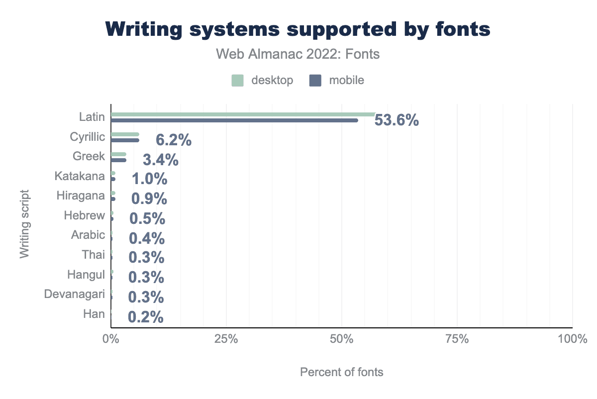 Sadly, other writing systems are much less prevalent. For example, Han (Chinese) is the 2nd most used writing system in the world (after Latin), but only supported by 0.2% of web fonts. Arabic is the third most used writing system, but again, only supported by 0.4% of web fonts. The reason that some of these writing systems are not used as web fonts is that they are very large due to the sheer number of glyphs they have to support, and the difficulty in subsetting them correctly.