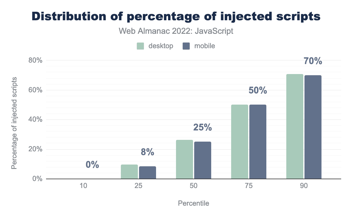 When contrasted with the total number of bytes loaded for mobile pages at the median, unused JavaScript accounts for 35% of all loaded scripts. This is down slightly from last year’s figure of 36%, but is still a significantly large chunk of bytes loaded that go unused. This suggests that many pages are loading scripts that may not be used on the current page, or are triggered by interactions later on in the page lifecycle, and may benefit from dynamic import() to reduce startup costs.