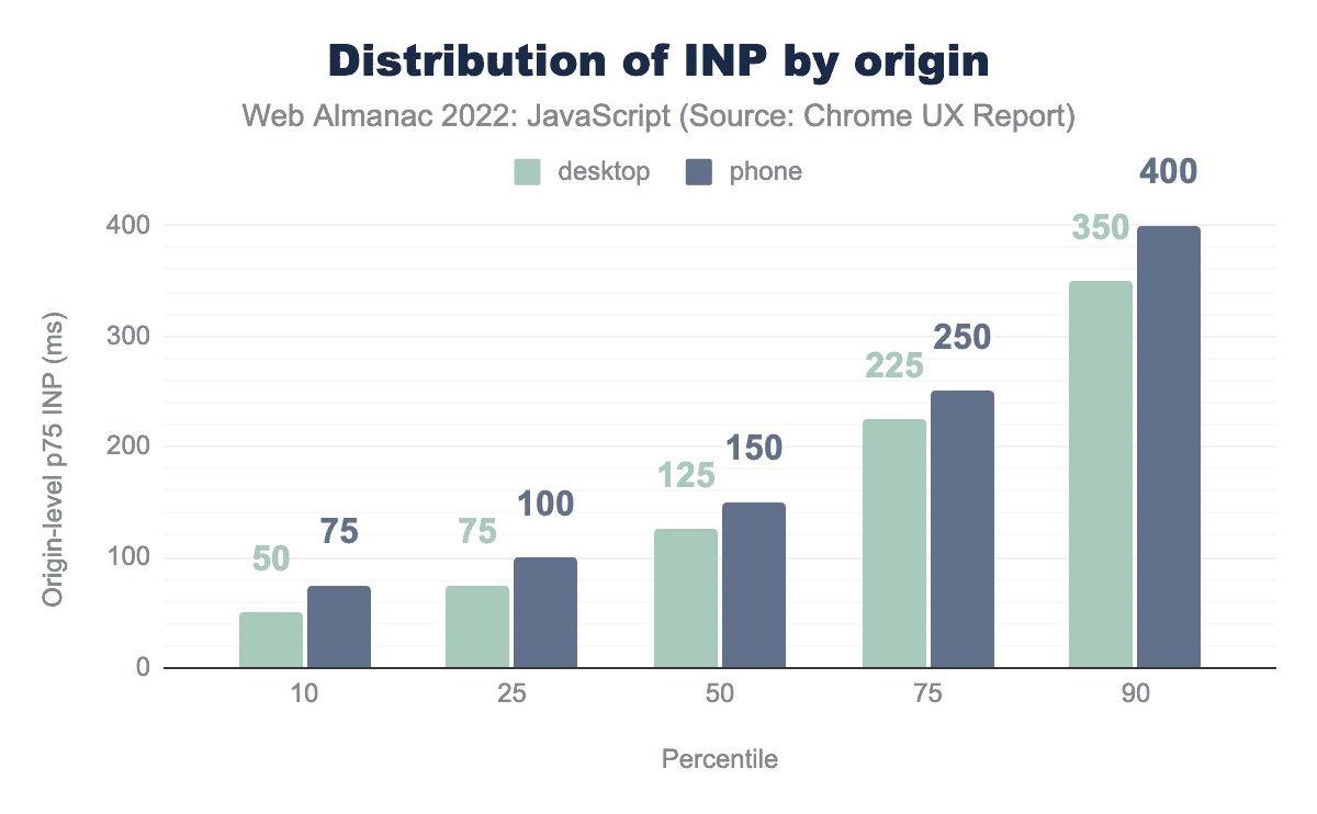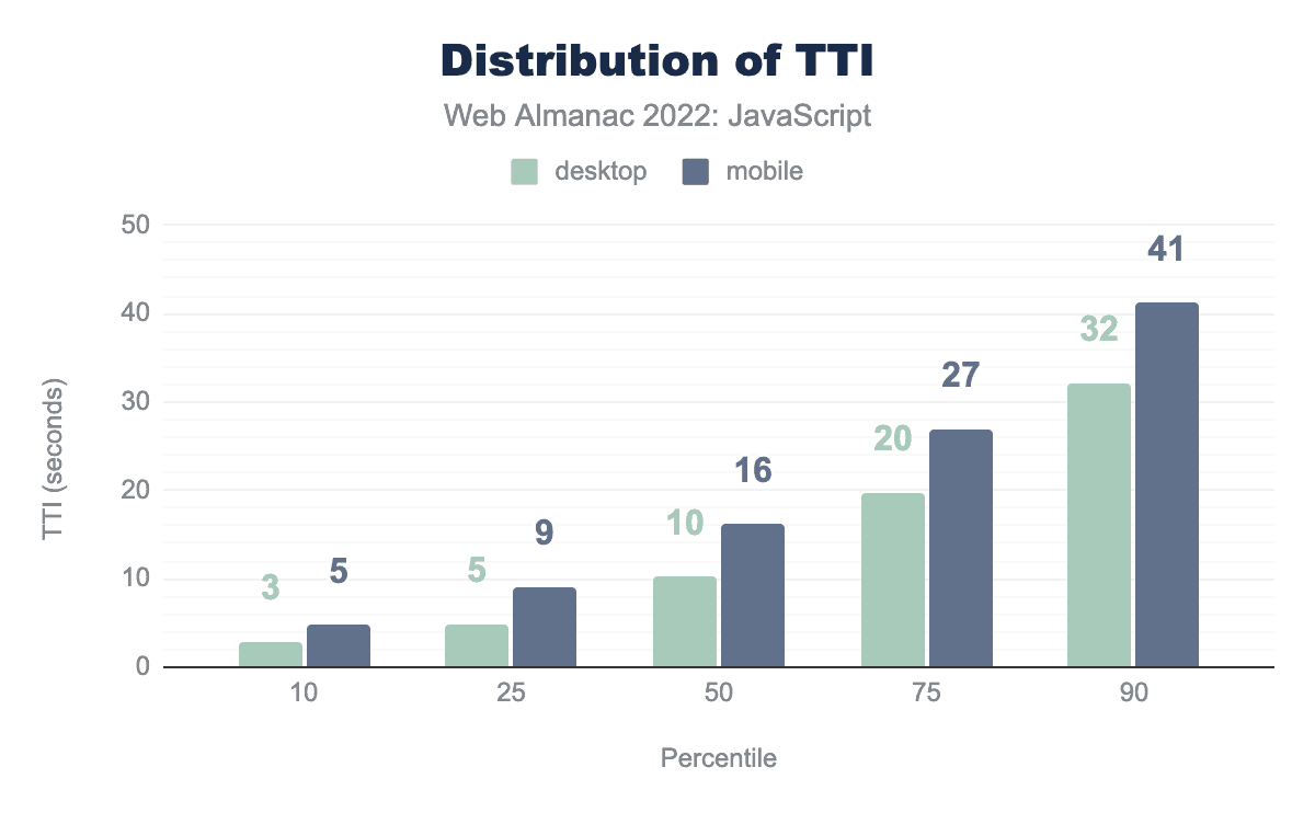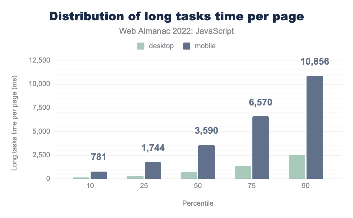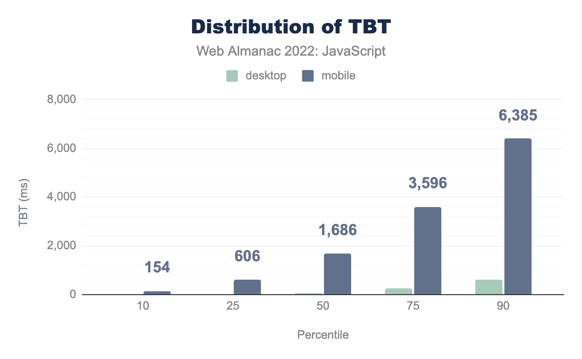 As was the case last year, this year marks yet another increase in the amount of JavaScript shipped to browsers. From 2021 to 2022, an increase of 8% for mobile devices was observed, whereas desktop devices saw an increase of 10%. While this increase is less steep than in previous years, it’s nonetheless the continuation of a concerning trend. While device capabilities continue to improve, not every one is running the latest device. The fact remains that more JavaScript equates to more strain on a device’s resources.