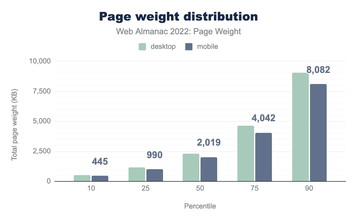 At the 50th percentile, desktop pages were over 2 MB, mobile pages just under that. By the 90th percentile, this has grown to a nearly 9.0 MB for desktop, and nearly 8.0 MB for mobile.