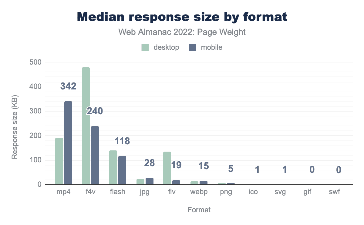Focusing on file formats, it’s disappointing to see f4v, flash, and flv adding significant weight to pages, the flash player plugin was discontinued in 2021, and removed from major browsers like Chrome, meaning these bytes are most likely entirely wasted.