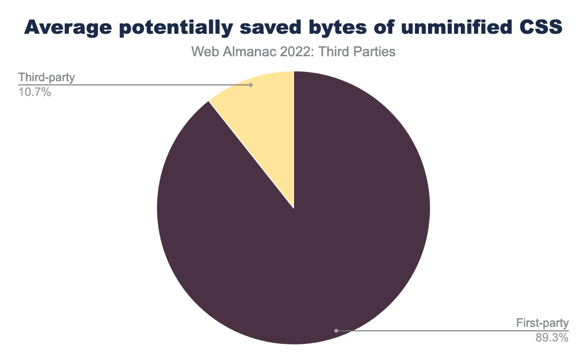 The unminified CSS audit shows that third-party assets have a much smaller impact, especially when compared with the first-party average of potentially saved bytes of CSS code, which is 89% of the total average potentially saved bytes. This data demonstrates that third-party CSS content is well minified and has a much lower impact than first-party CSS.