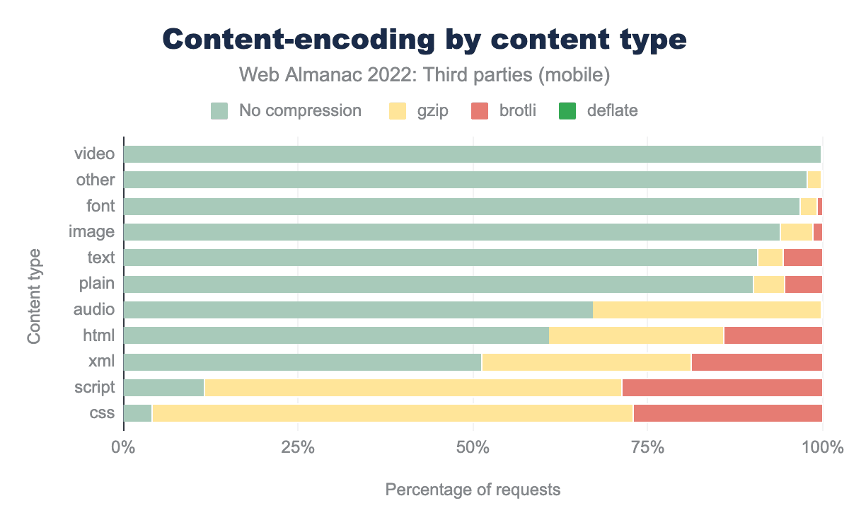 Compressing files is another quick win that third-party developers can do to have a positive impact on web performance. Most heavy content types like scripts and CSS have a good compression coverage. Only 12% of scripts and 4.5% of CSS files of total third-party requests are not compressed.