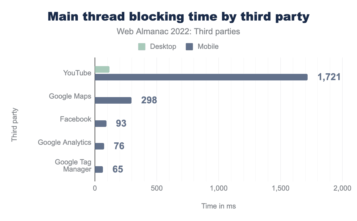 YouTube is the most blocking third party among the top 5 most-used third parties. It blocks the main thread for more than 1.7 seconds for the median website that loads YouTube videos—based on the mobile device we emulate as part of our crawl. There is a notable gap between desktop and mobile websites as the desktop websites are almost completely unaffected.