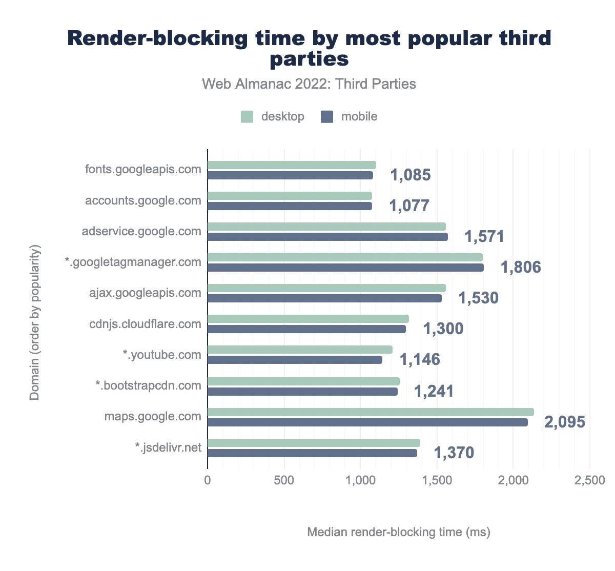 The figure above shows the median render-blocking time for the top 10 most popular third parties. Google maps have the most significant impact on rendering time. It accounts for more than 2 seconds for the median website. That is a significant impact taking into account that the recommended time for First Contentful Paint—a page load speed metric—is 1.8 seconds.