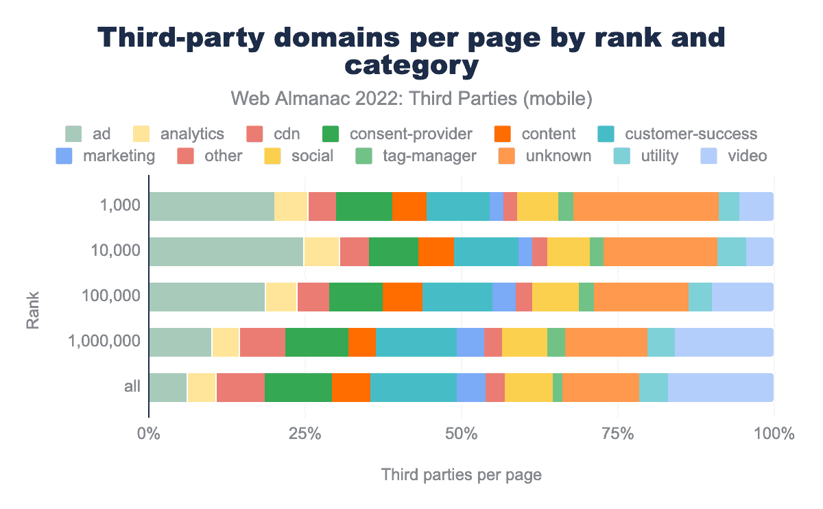 When looking at the distribution of third parties by category and by rank, it becomes clear that the increase in the number of third parties on more popular websites is mostly made up of the ad and unknown (i.e. unclassified) third-party categories. That means the third parties—especially ads—have a crucial impact on the users because they are more used on websites with a larger number of users.